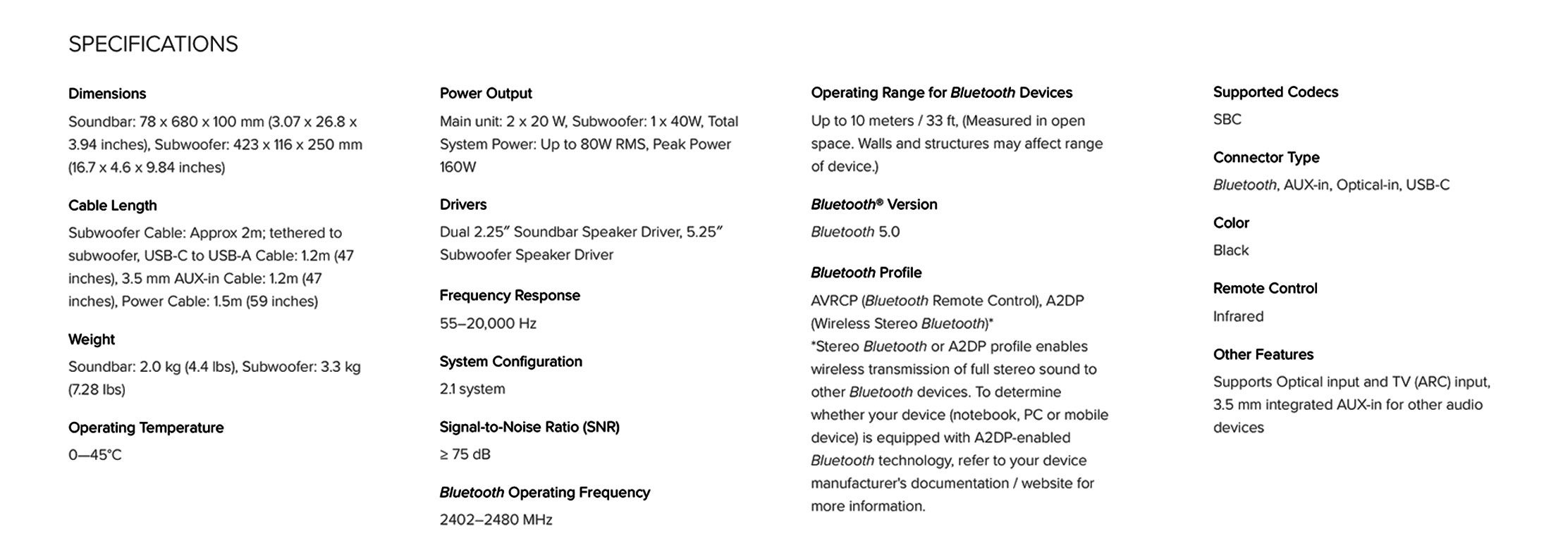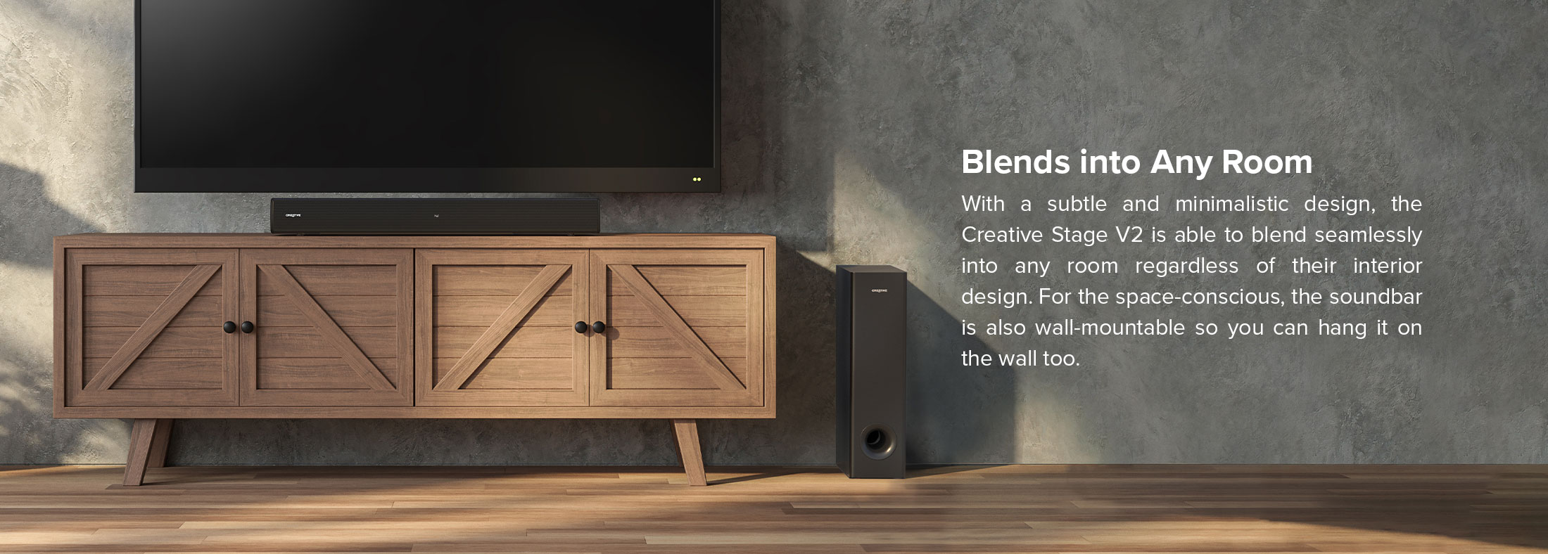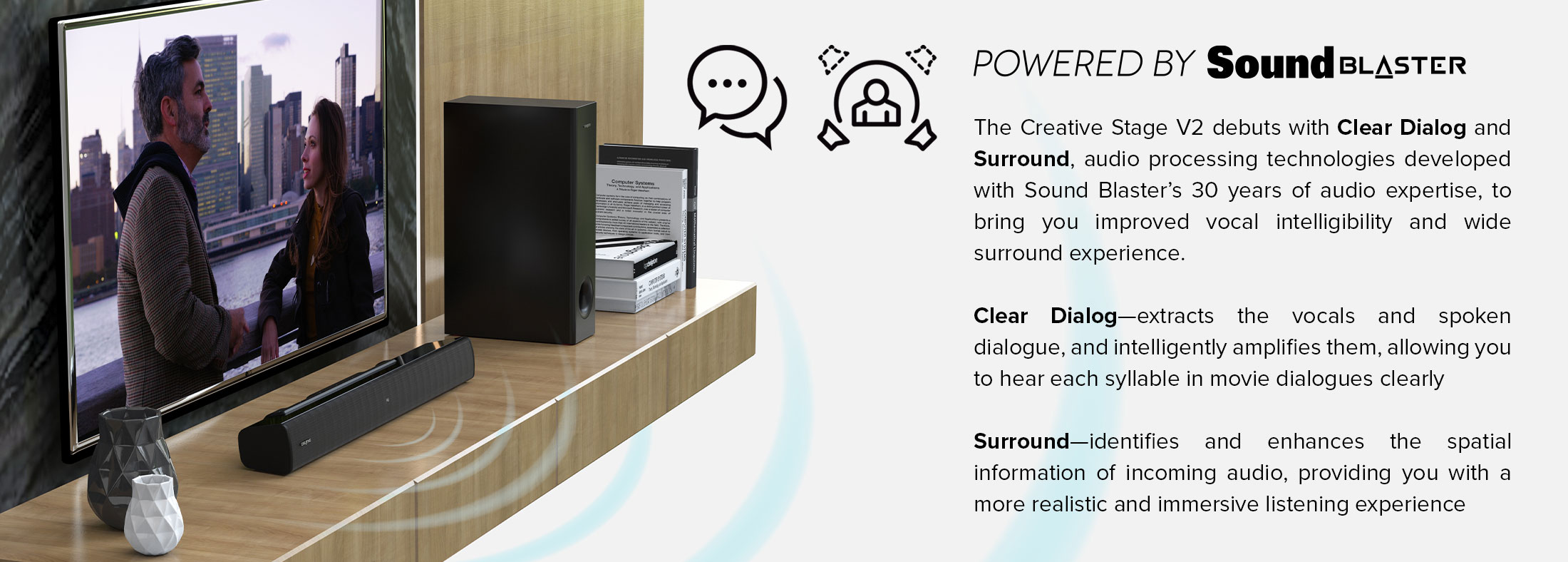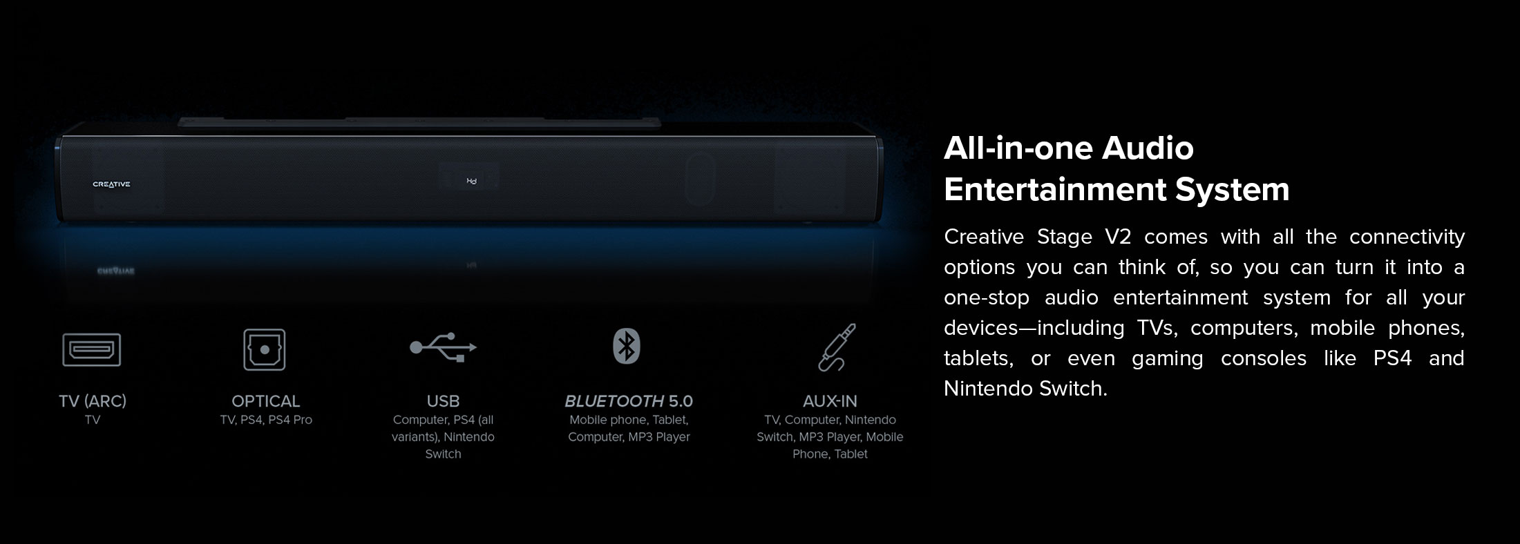 Creative Stage V2-2.1条形音箱,带低音炮、清晰对话和Sound Blaster环绕声、蓝牙5.0、电视ARC、光学和USB音频、壁挂式、可调节低音和高音,适用于电视